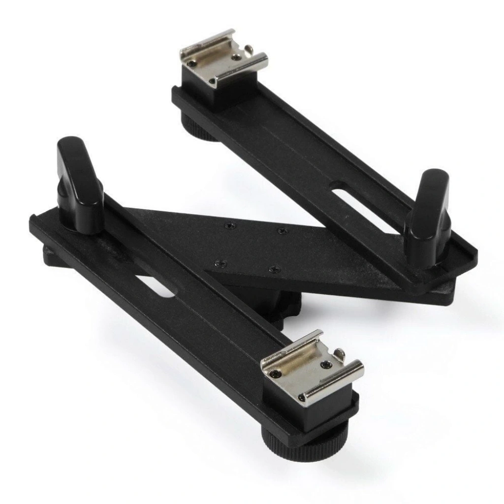 Çift flaş braketi plakası, iki flaş veya video ışıkları, kameranıza uzaktan kumanda gibi diğer aksesuarları monte etmenizi sağlayan çift sıcak ayakkabı sağlayan ayarlanabilir kollu dayanıklı bir yatay flaş braketidir. Braketi kameraya bağlamak için altta standart bir adaptör ayakkabısı vardır. Braketi bir tripoda monte edebilirsiniz.