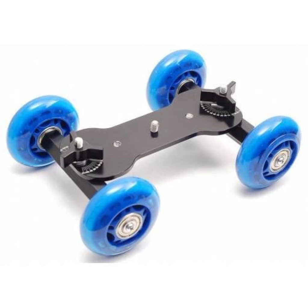 4 Tekerlekli Mini Dolly Kamera Arabası, DSLR Video çekimlerinde filme dinamik, dairesel, yanal, panoramik görüntü vb. için ideal bir araçtır. Dolly'nin ön iki tekeri ve arka iki tekeri istenilen açılarda ayarlanarak objenin çevresinde, dikey ve yatay olarak aynı doğrultuda veya istenilen çaplarda dairesel hareketler için ayarlanabilir. Dolly'nin kauçuktan yapılan tekerlekleri sayesinde zeminde sessiz ve pürüssüz hareket etmek mümkündür.