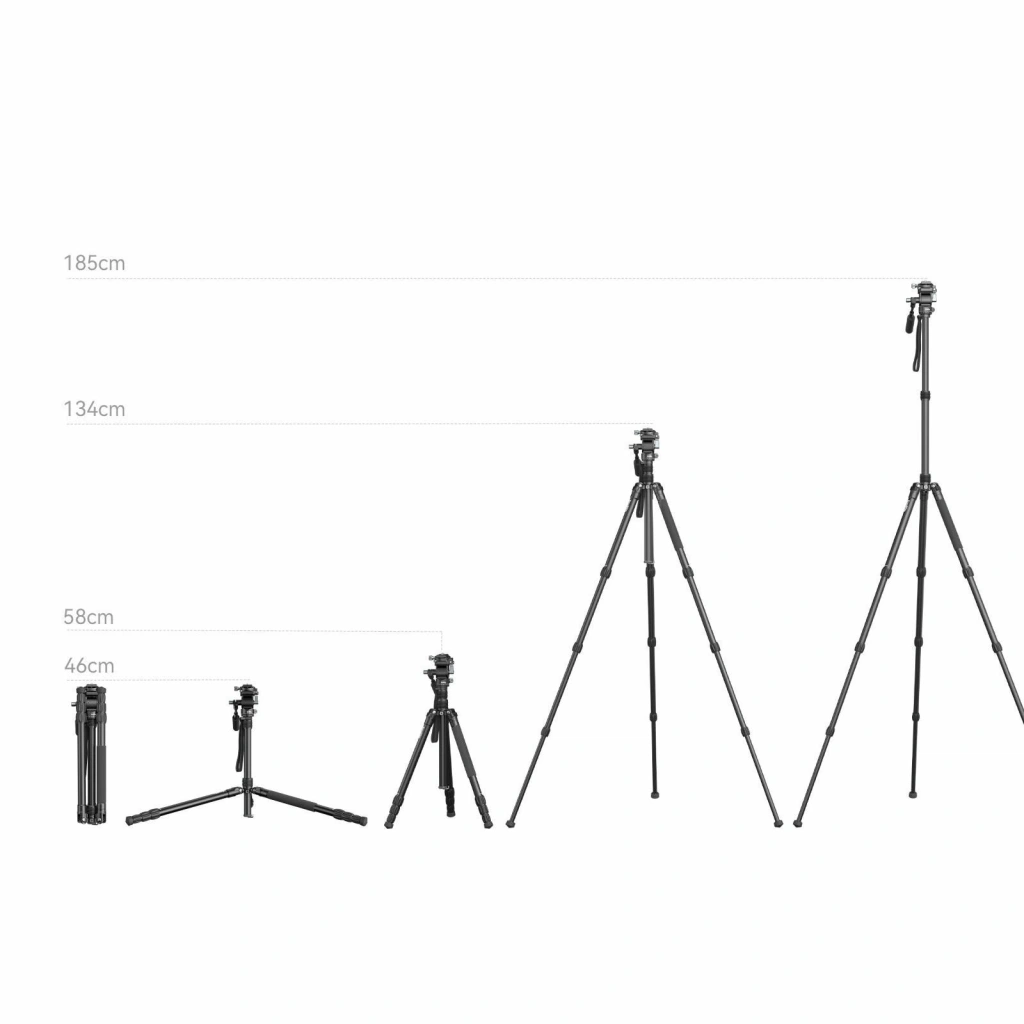 SmallRig FreeBlazer Alüminyum Alaşımlı Video Tripod CT195 4307, özellikle dış mekan senaryolarında video çekimi, canlı yayın, vlog vb. için özenle tasarlanmıştır. 46 cm'ye kadar katlanabilen ters katlanabilir Alüminyum alaşımlı bacaklara ve dengeyi artırmak için bir orta sütuna sahiptir. Topuz kilitli 4 bölümlü bacaklar, çalışma yüksekliğini saniyeler içinde 185 cm'ye kadar ayarlamanıza olanak tanır ve çıkarılabilir orta sütun, düşük açılı çekimler için ters çevrilebilir. Bacaklardan birini söküp kafaya takarak tripodu bir monopoda dönüştürebilirsiniz. İhtiyaçlarınızı karşılamak için hızlı açı ayarı için 3 duraklı (23° / 55° / 79°) bir düğme bulunur. Üstteki Video Head 4104 ise yatay ve dikey çekim arasında hızlı geçiş yapmayı ve hızlı çıkarma plakasının, destek kafesinin ve L braketinin montaj yönünü ayarlamayı sağlar. Ayrıca, kolayca saklanabilen ve başlığın 360° dönmesini ve +90°/-90° sabit bir şekilde eğilmesini sağlayan çıkarılabilir teleskopik bir sapla birlikte gelir. Ayrıca, bu tripod, 1/4"-20 dişli delik aracılığıyla sihirli kol gibi aksesuarları da destekleyebilir. Sadece 2,0 kg ağırlığında ve 5 kg'a kadar taşıma kapasitesine sahip olması, onu açık havada çekim yapmak için iyi bir arkadaş yapar.