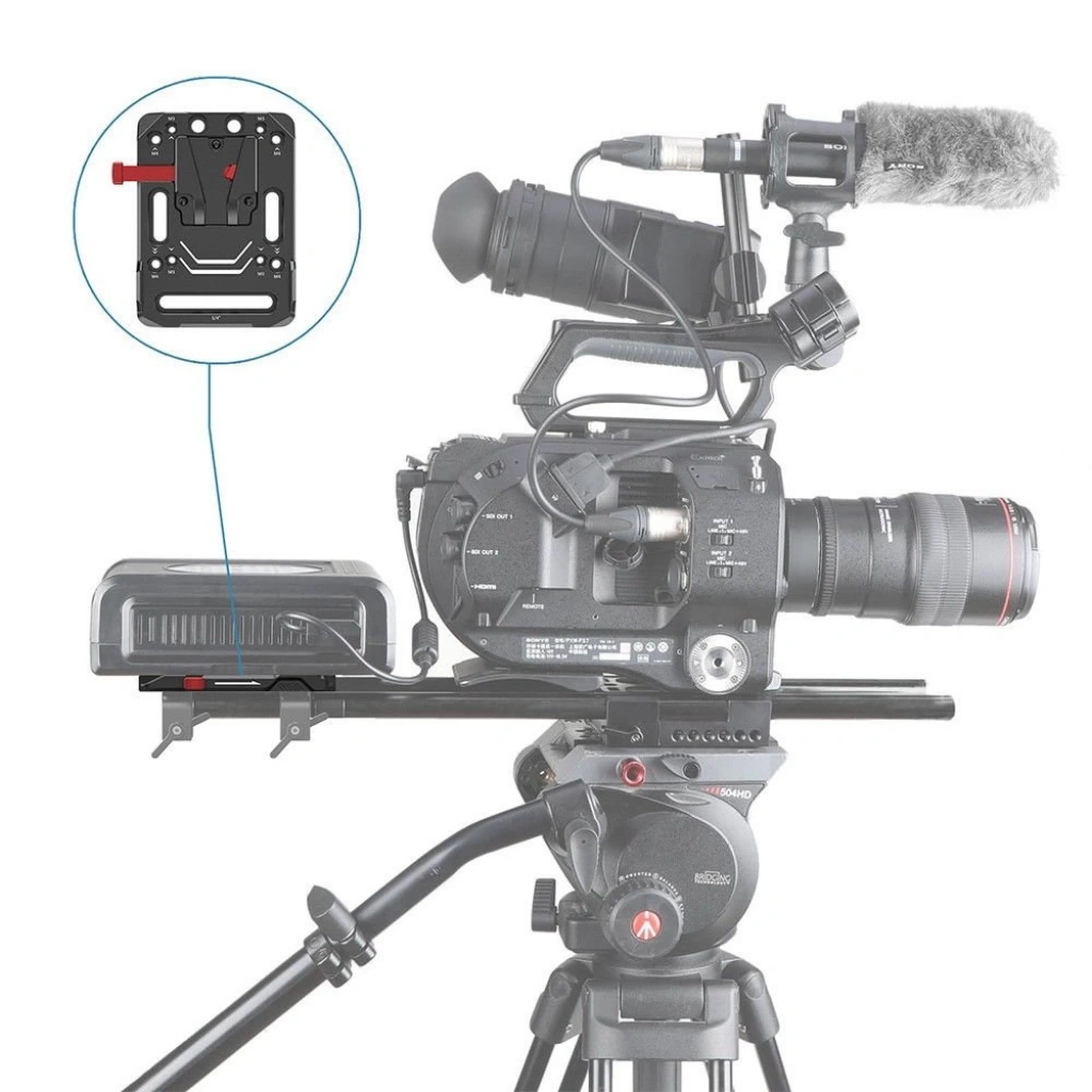 1. Standart V yuvası kullanan plaka, pilinizin güç portu(ları) ile kamera teçhizatınız için daha uzun pil ömrü sağlamak için çoğu V yuvası piline uyar.
