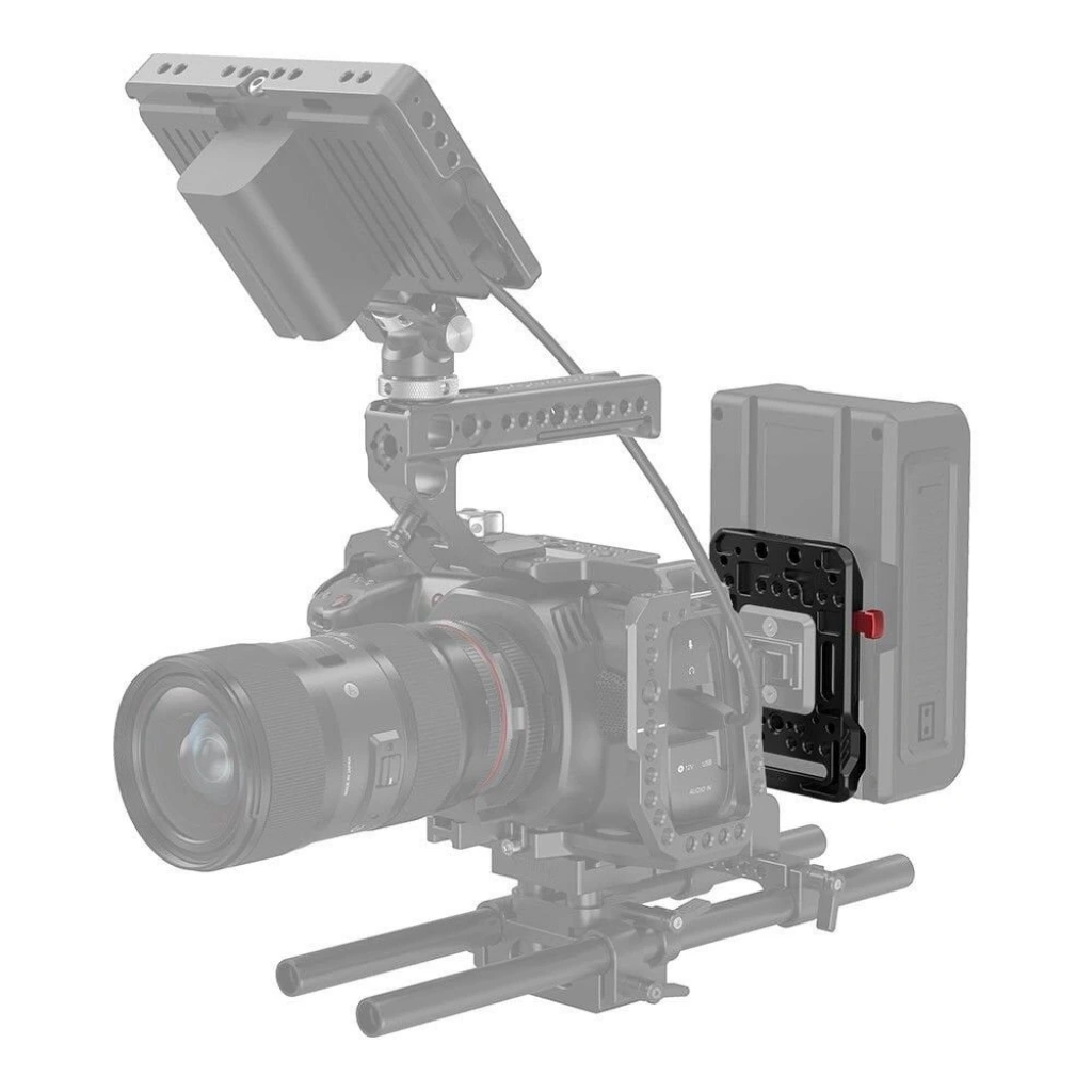 SmallRig V Mount Pil Plakası 2988, standart bir V yuvası kullanarak, pilinizin güç portu(ları) ile kamera teçhizatınız için daha uzun pil ömrü sağlamak üzere çoğu V yuvalı pile uyar. Birden fazla 1/4-20" havşa, M3 havşa, M4 havşa, 1/4-20" dişli deliği, M4 dişli deliği ve çift çubuk kelepçesi, sihirli kol veya diğer aksesuarları takmak için bir ARRI 3/8" -16 dişli deliği içerir. İki durdurucu, takıldığında pilin dönmesini önler. Plaka, çeşitli farklı kurulum yollarını destekler ve Blackmagic URSA mini ile uyumludur.