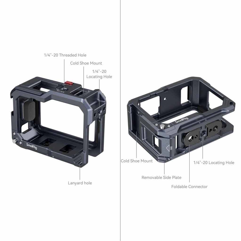 GoPro Hero 13/12/11/10/9 Siyah 3084C için SmallRig Kafes, kamerayı korumak ve aksesuar montajları sağlamak için tasarlanmıştır. Kafes kameraya o kadar iyi oturuyor ki ekranı, düğmeleri ve USB-C bağlantı noktasını engellemiyor. Kapağa basılarak hızlı bir şekilde kilitlenebilir ve düğmeye basılarak serbest bırakılabilir ve üstte ve sağ tarafta bir mikrofon ve LED video ışığıyla uyumlu iki soğuk ayakkabı yuvasıyla birlikte gelir. İçi boş oymalı soğuk ayakkabı tasarımı GPS sinyalini engellemez. Altta, bir GoPro montajı ve orijinal GoPro aksesuarlarını veya Tripod , Magic Arm / , Yengeç Şekilli Kelepçe B / , Vantuz Montajı destekleyen 1/4"-20 dişli delik vardır. . Yan plaka aynı zamanda kapağa basılarak hızlı bir şekilde kilitlenebilir ve pil anahtarları için düğmeye basılarak serbest bırakılabilir ve c tipi bağlantı noktasına erişim sağlar; kolayca monte edilebilecek veya çıkarılabilecek şekilde yan plakayı tutabilirsiniz. Kameranın daha iyi korunması için orijinali sökmeden plakayı yerine takın.