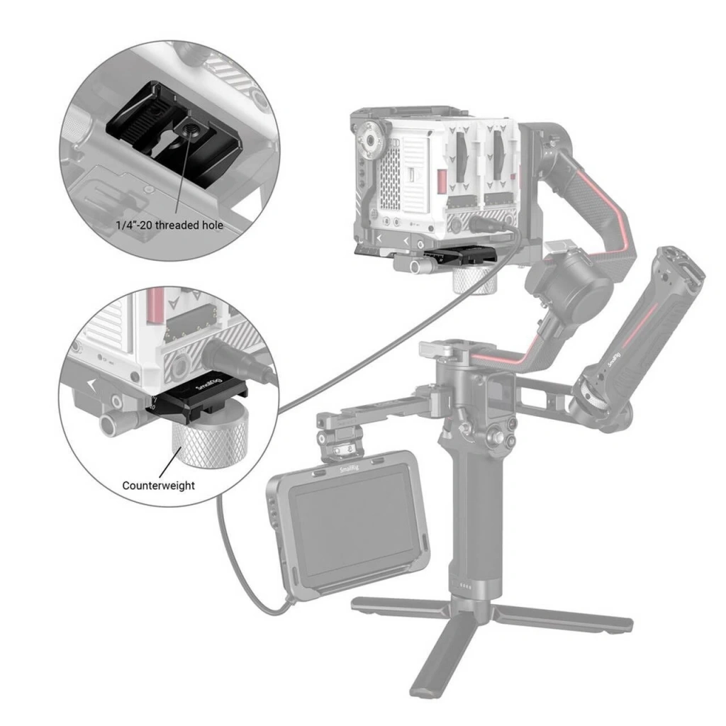 DJI RS 2 / RSC 2 / Ronin-S için SmallRig Manfrotto Hızlı Çıkarma Plakası Gimbal 3158 , kameranın Manfrotto tripod, omuz, gimbal ve diğer çekim modları arasında hızlı geçiş yapmasına yardımcı olmak için tasarlanmıştır. Entegre Manfrotto hızlı çıkarma plakası, etkili bir şekilde bükülmeyi önleyen iki vidayla kameranın veya video kameranın altına sabitlenir. Kuyruğunda 1/4 dişli delik bulunan plaka, denge için ağırlıklar veya karşı ağırlık kiti 3125 takılabilir . Kamerayı ileri veya geri ayarlamak için plakanın altında çıkarılabilir bir dişli raf bulunmaktadır. Orijinal takip odak çubuğu montajı ile uyumlu üç M4 dişli deliğe sahiptir.