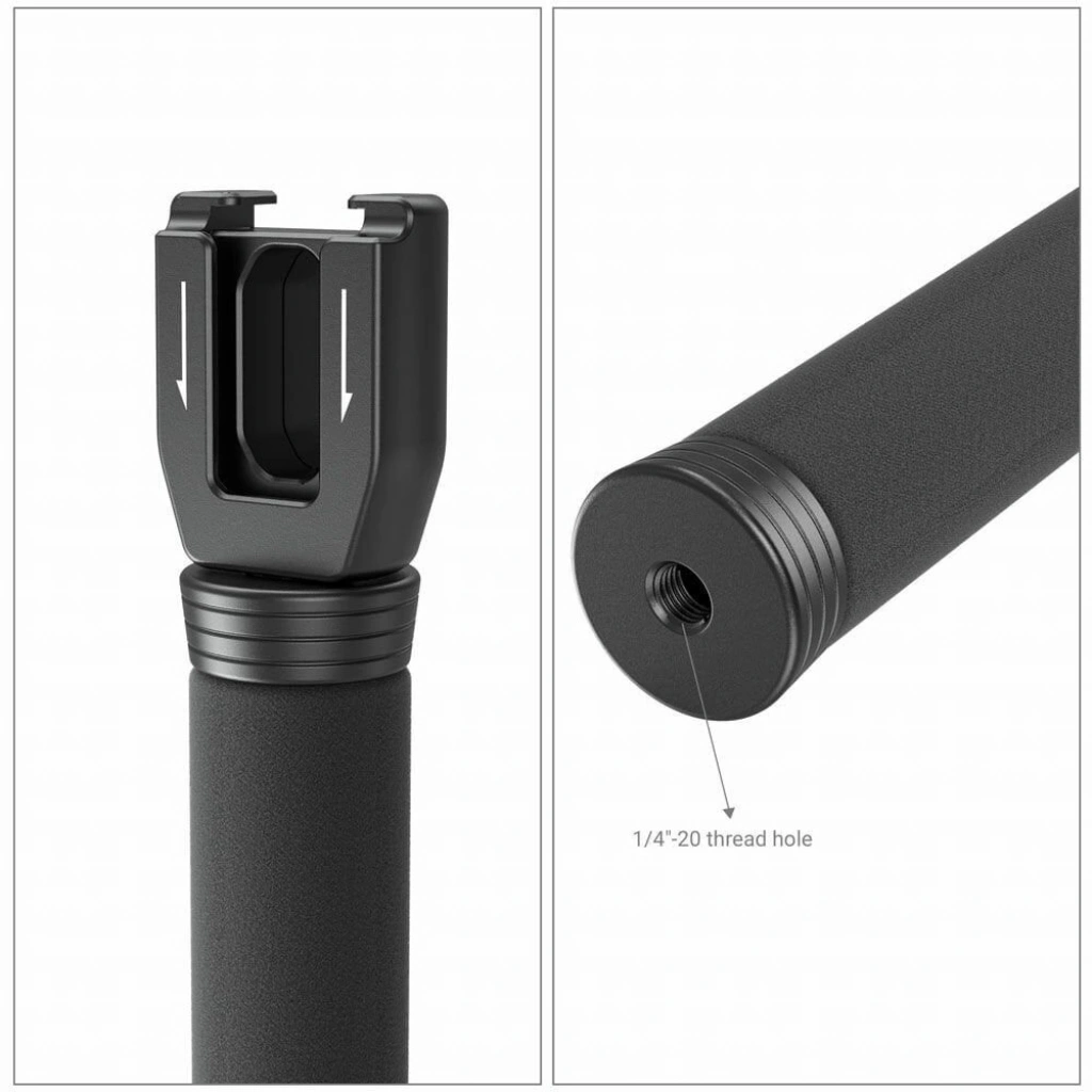 elde taşınır kablosuz go kullanan görüşmeler için tasarlanmıştır. Çeşitli sahnelerdeki mikrofonlara uyması için bir yatay ve bir dikey soğuk ayakkabı yuvası ve daha iyi bir görüşme deneyimi sağlamak için ayarlanabilir bir çubukla birlikte gelir. Altta, diğer çekim aksesuarlarına monte etmek için 1/4”-20 dişli delikler bulunur. Kompakt, taşınabilir, kaymaz ve donma önleyici süngerden yapılmış mikrofon tutacağı kolayca tutulur ve rahat bir tutuş deneyimi sunar.