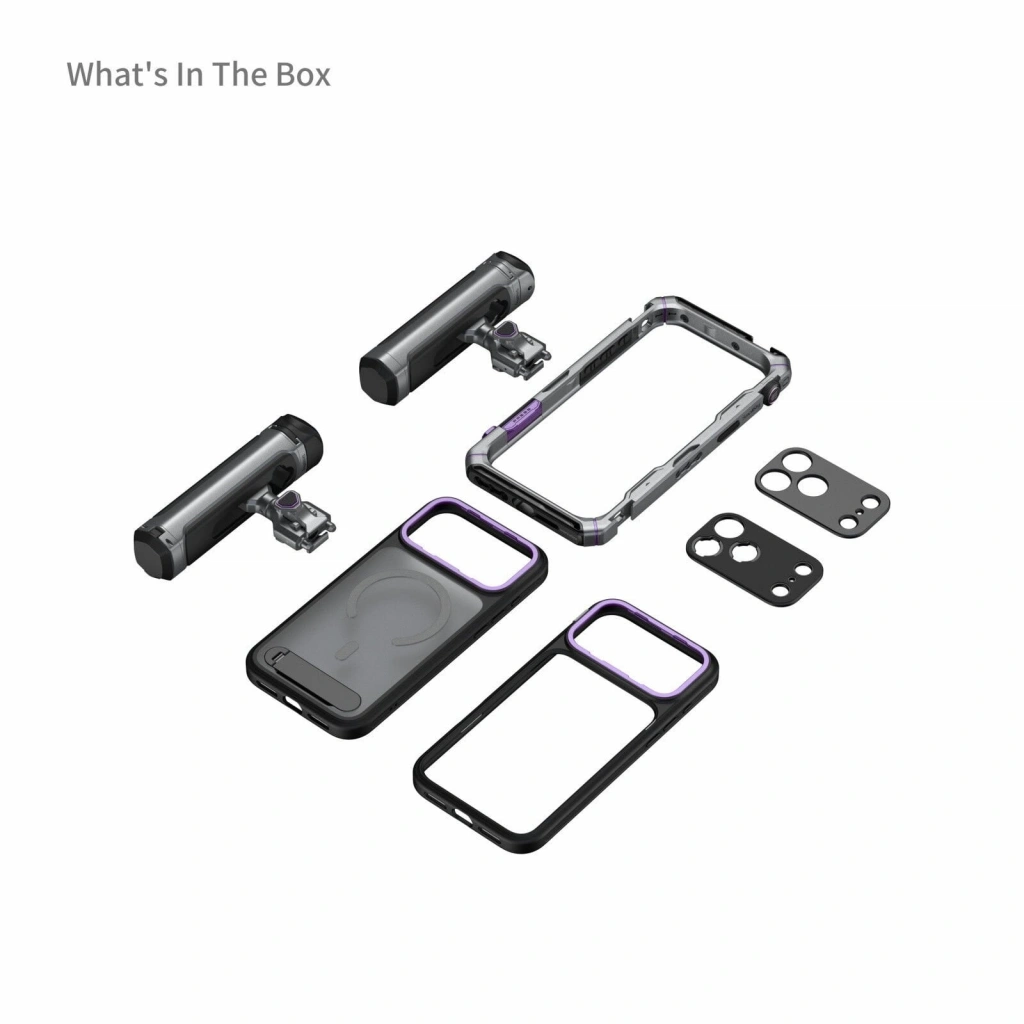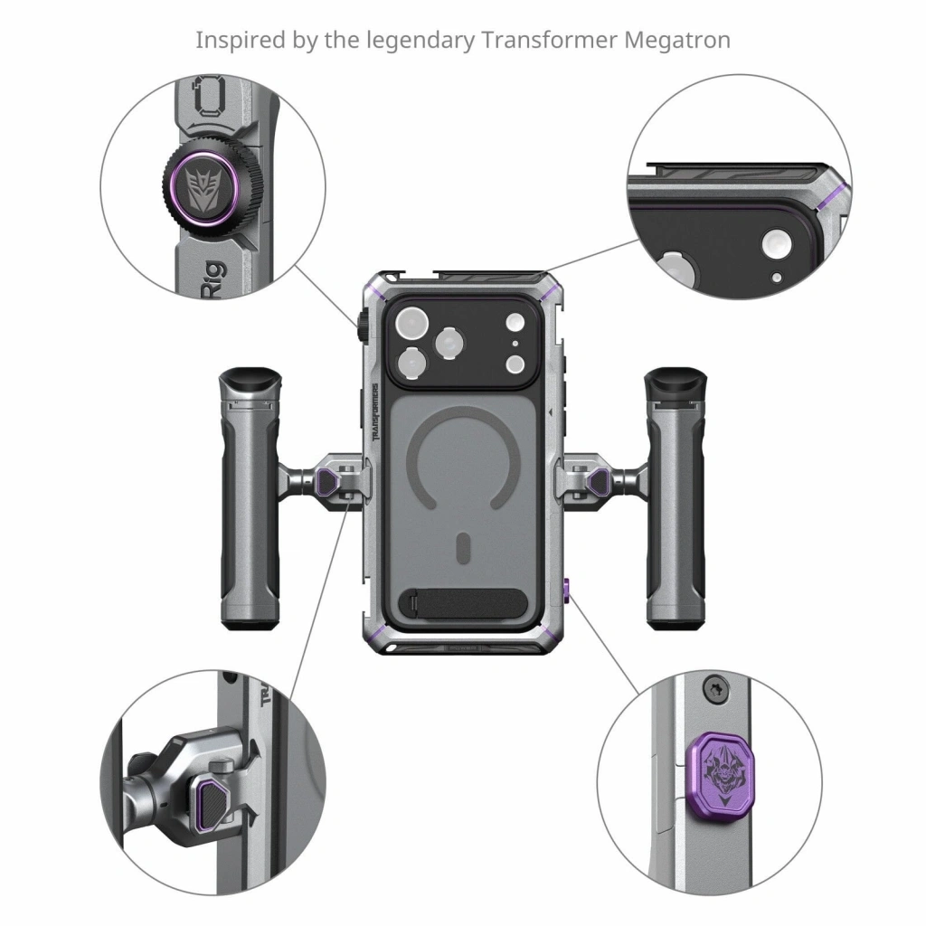 SmallRig Megatron Edition iPhone 17 Pro Max için Çift El Tipi Mobil Çekim Kiti 5584, profesyonel düzeyde video kaydı, canlı yayın ve kısa film prodüksiyonunu kolaylaştırmak için özel olarak iPhone 17 Pro Max için tasarlanmış profesyonel bir çift el tipi çekim çözümüdür. Bu kapsamlı kit, bir telefon kılıfı, video kafesi, dönebilen kablosuz kontrol yan kolu, dönebilen yan kol, TPU yumuşak tampon ve harici lens için 2 adet arka panel içerir.