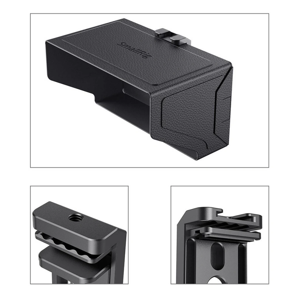 SmallRig Akıllı Telefon Güneşlik (Küçük) VH2689 , akıllı telefonu harici bir kamera monitörü olarak kullanırken akıllı telefona güneşlik seçeneği sağlamak için tasarlanmıştır. Kapak, parlamayı azaltmaya yardımcı olur, açık havada veya parlak ışıkta çekim yaparken net ve parlak bir ekran sağlar. Sanki bir monitör monte etmek için 1/4” -20 dişli deliğin altında bulunmaktadır SmallRig Mafsallı ve Eğim Monitör Dağı BSE2294 , Soğuk Ayakkabı BSE2431 ile SmallRig Eğme Monitör Dağı , Soğuk Ayakkabı BSE2346 ile SmallRig Mafsallı ve Tilt Monitör Dağı, vb. Üstteki soğuk yuva, bir mikrofon veya bir LED ışığı monte etmek için kullanılabilir. Patent bekleyen kelepçe, arkadaki kaydırıcıya basılarak açılacak ve iPhone 8, iPhone X / XS, iPhone 11 Pro, Samsung Galaxy S10 ve benzer boyuttaki diğer akıllı telefonlar dahil olmak üzere 67 mm'den 71 mm'ye kadar genişliğe sahip akıllı telefonlarla uyumlu olacak. Güneşlik aşınmaya ve çizilmeye karşı dayanıklıdır. İçerisindeki mikrofiber bez, ışığın yansımasını azaltmaya yardımcı olur. Deri başlık, kelepçeye rahatça takılır ve kullanıp kullanmamayı seçebilirsiniz. Güneşlik katlanabilir ve kolayca saklanacaktır.