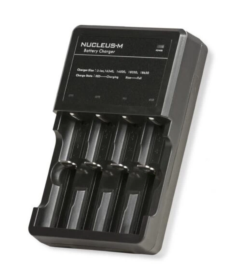Bu akıllı şarj cihazı, duvardaki AC gücü, 12V araç gücü veya 5V USB gücü aracılığıyla bir ila dört IMR/Li-ion pili aynı anda şarj edebilir. Nucleus-M kitiyle birlikte gelir ve Nucleus-M'nin el ünitesine ve kollarına güç sağlamak için gereken 18650 pilleri şarj etmek için kullanılır. Şarj cihazı, 18650 pillerin yanı sıra 26650, 22650, 18490, 17670, 17500, 10400, 16340, 14500, 18350, (RCR123) ve Ni-MH/Ni-Cd: AA, AAA, AAAA, C pilleri de şarj edebilir. Her pil bölmesinin üstünde LED göstergeler bulunur. LED'ler şarj miktarını gösterir: Pilin üzerindeki sabit mavi LED çubuk tam şarj olduğunu, kırmızı LED ise pilin hala şarj olduğunu gösterir. Pil yuvaları optimum uyum için yaylıdır.