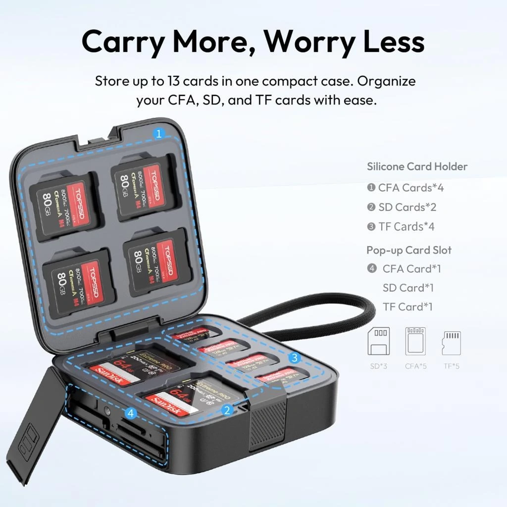 ![]() | Daha Fazla Taşı, Daha Az EndişelenBir kompakt kılıfta 13 karta kadar depolama imkanı sunar. CFA, SD ve TF kartlarınızı kolayca organize edin. |