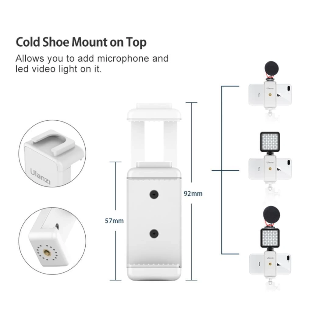 Ulanzi ST-07 Vlog Phone Clip ürünü üst kısmında yer alan cold shoe girişiyle, telefonunuza mikrofon, mini ışık ve benzer aksesuarların kullanımını kazandırır. Bu sayede kusursuz video ve fotoğraflar çekmeniz kolaylaşacaktır.